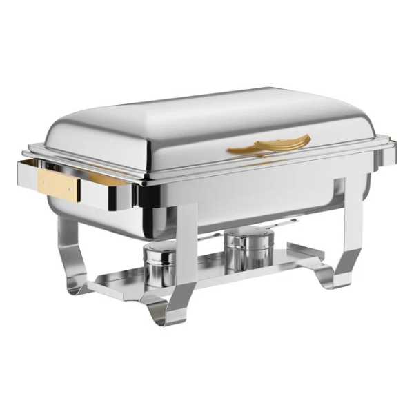 Chafer Acopa Supreme de 9 cuartos de galón con tapa abatible y detalles dorados.